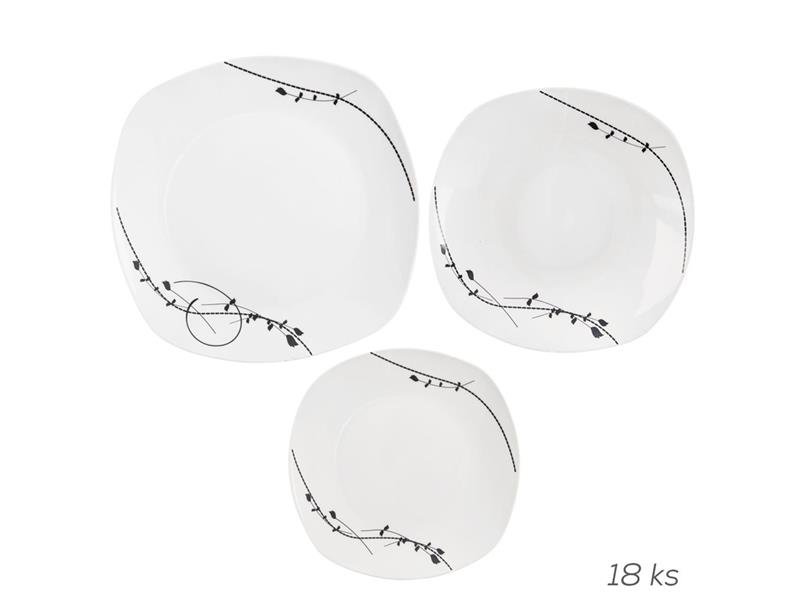 Jídelní sada porcelánová obsahuje 18 dílů – 6x talíř dezertní, 6x talíř hluboký a 6x talíř mělký. Hranatý tvar talířů. Jemný dekor. Talíře můžete dávat do myčky na nádobí, ale nedoporučejeme to – vlivem čistících prostředků používaných v myčkách může dojít k poškození dekoru (není pak důvod k reklamaci). Lze použít v mikrovlnné troubě.