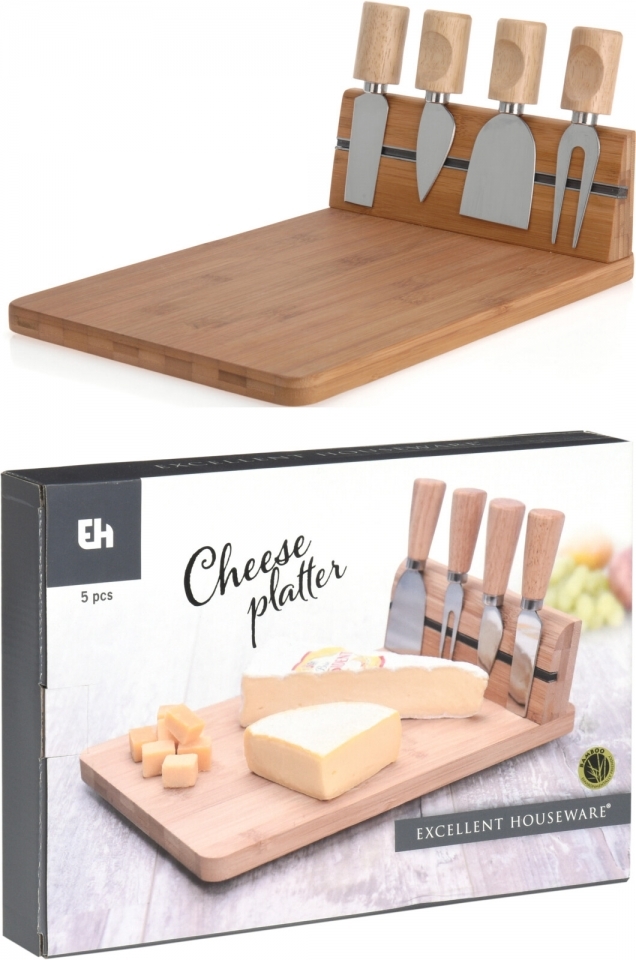 Servírovací sada na sýry. Součástí je prkénko s magnetickým stojanem na nože a 4 druhy nožů.Materiál: bambus, nerez ocelRozměry:prkénko 30x20x1,5 cmcelková výška 8,5 cm przeczytaj całość