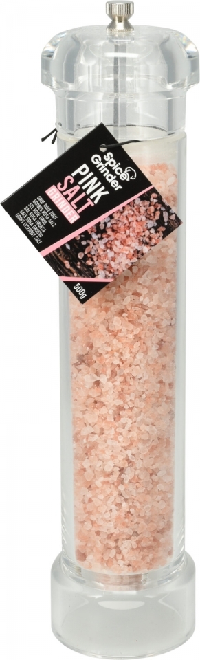 Akrylowy młynek do mielenia soli i pieprzu. Grubość mielenia można regulować za pomocą obrotowego mechanizmu na spodniej stronie. Młynek wykonany jest z lekkiego, trwałego plastiku. Mechanizm młyński ceramiczny, trzonek aluminiowy. W skład zestawu wchodzi sól różowa.