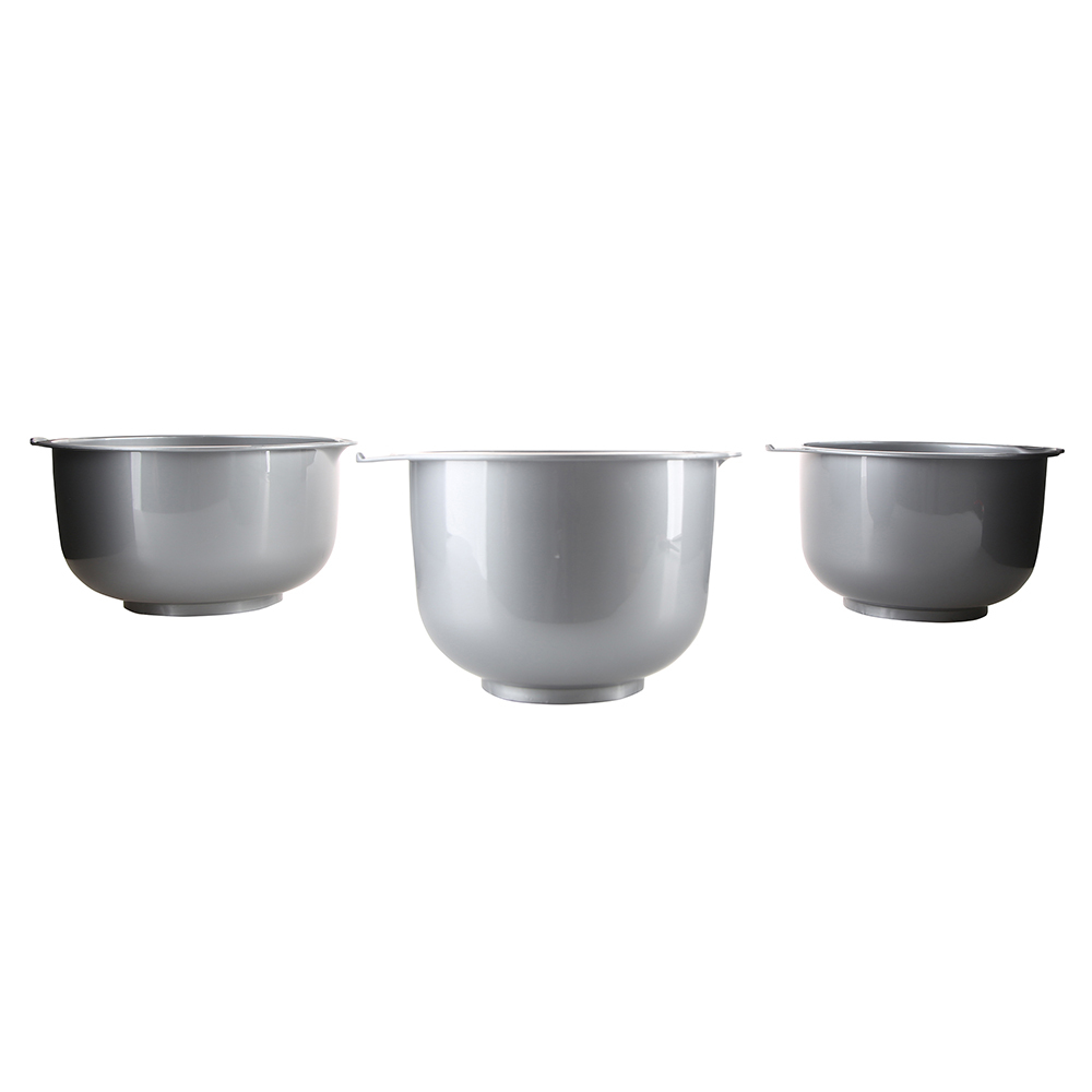 Okrągłe miski. Komplet 3 srebrnych misek o wymiarach- średnice: 23/19/17 cm ipojemnościach: 3/2/1,5 L. Wykonane z wysokiej jakości tworzywa. Idealne do mieszania, miksowania i innych prac kuchennych. Są łatwe w utrzymaniu czystości. Mogą być myte w zmywarce. przeczytaj całość