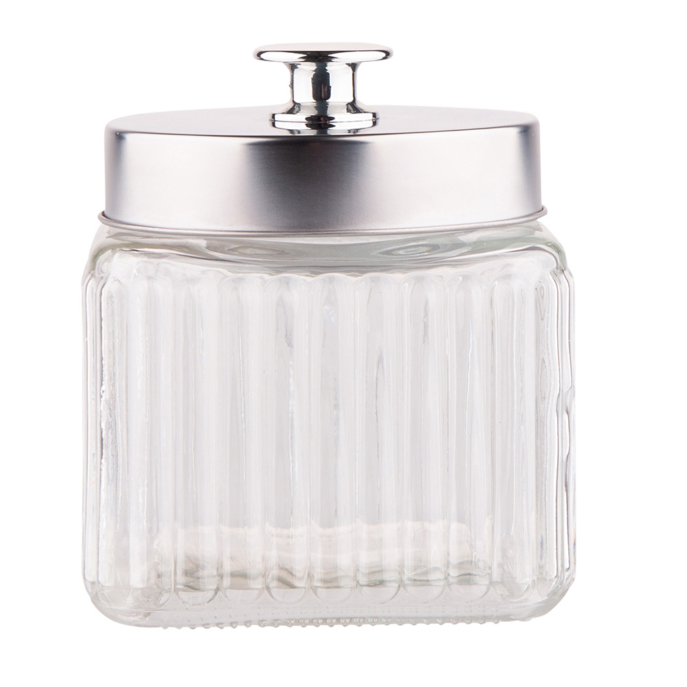 SKLENĚNÁ ČTVERCOVÁ NÁDOBKA S STŘÍBRNÝM VÍČKEM 850ML RELIÉFOVÁ KRYT
