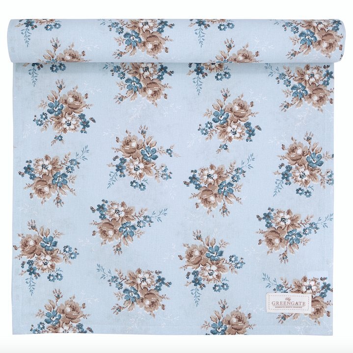 Bavlněný běhoun na stůl Marie Dusty Blue s květinami na modrém podkladu z kolekce Marie dánské značky GreenGate. przeczytaj całość