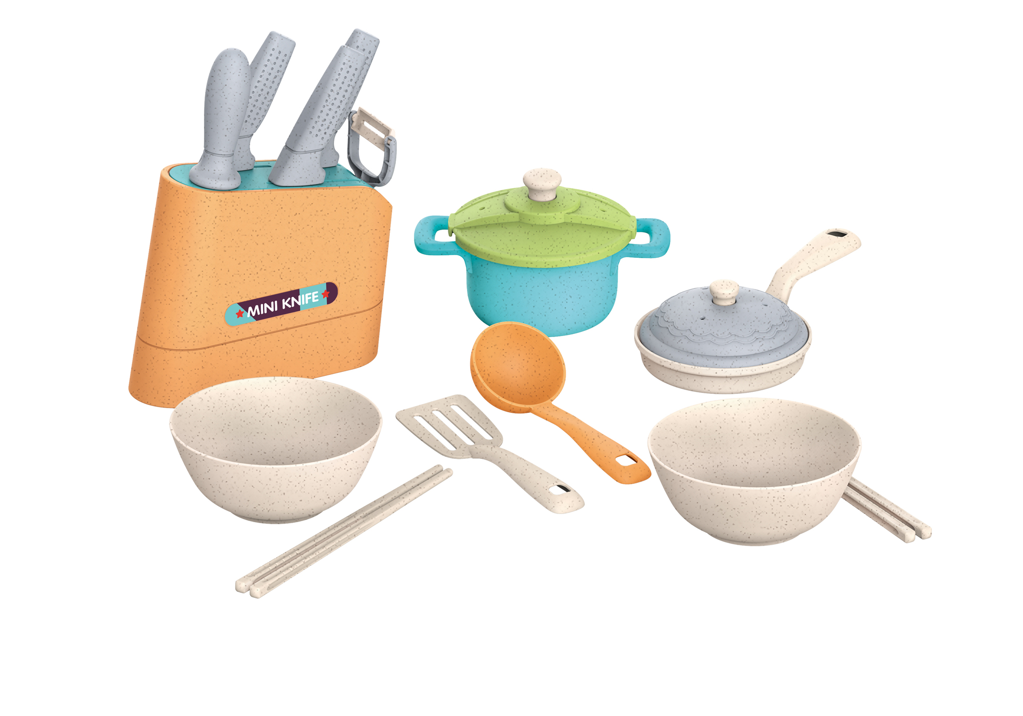 Kuchyňské nádobí Organic. Hrnec s poklicí, pánvička s poklicí, 2 misky, 3 nože, zásobník na nože, brousítko nožů, škrabka, 2 naběračky, 2 hůlky. przeczytaj całość