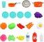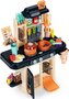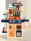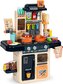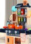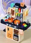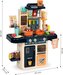 W zestawie: sztućce, talerze, kubek, chochla, łopatka, łyżki, garnek z pokrywką, patelnia, miarka, butelka, mleko, keczup, zupy, owoce i warzywa, kurczak, ryba, krab, kotlet, jajko, pudełko po lodach, ściereczka itp. Wymiary złożonej kuchni: 63 x 31 x 47 x 23 cm. Zasilanie: 3 baterie AA (brak w zestawie).