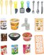 Zestaw zawiera: sztućce, talerze, kubek, chochla, łopatka, łyżki do mieszania, garnek z pokrywką, patelnia, miarka, butelka, mleko, ketchup, zupy, owoce i warzywa, kurczak, ryba, krab, kotlet, jajko, pudełko po lodach, ściereczka i inne. Rozmiary złożonej kuchni: 63 x 31 x 47 x 23 cm. Zasilanie: 3 baterie typu AA (nie są dołączone).