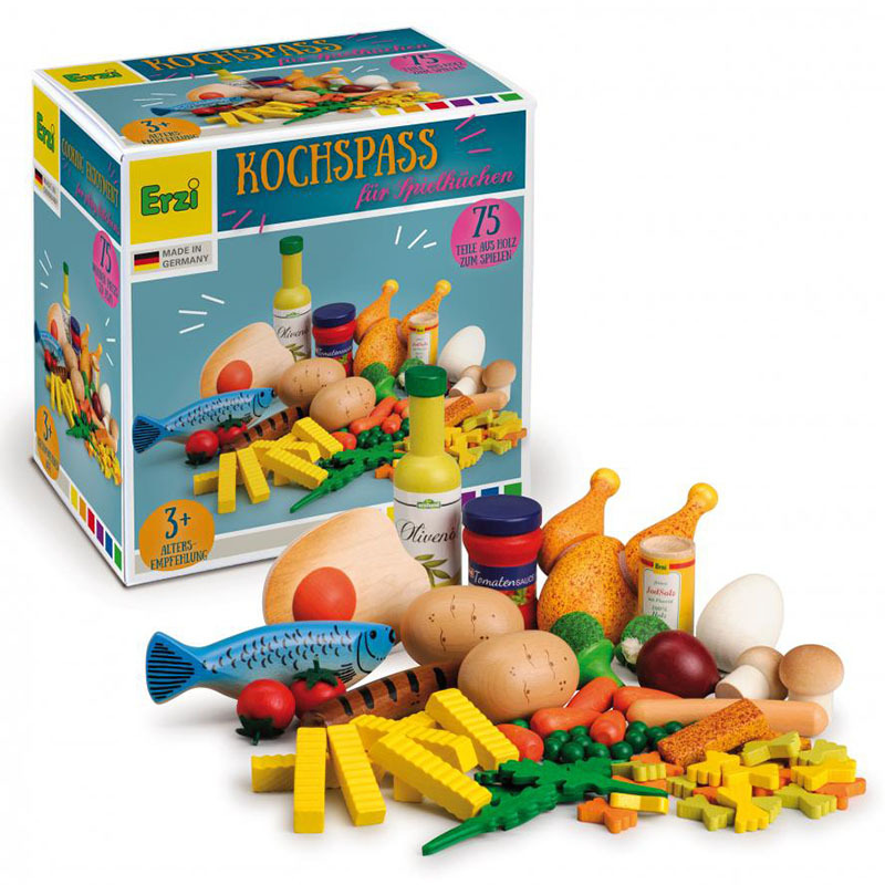 Duży, drewniany zestaw do zabawy w gotowanie to propozycja niemieckiej marki Erzi na udaną zabawę w szefa kuchni. Zestaw został wyprodukowany w Niemczech oraz posiada certyfikaty bezpieczeństwa CE oraz ASTM. Zestaw wykonany z drewna buku obejmuje aż 75 elementów. W zestawie znajdują się: 2...