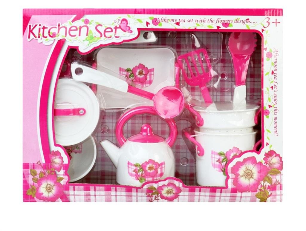 Zestaw kuchenny który zawiera wiele akcesoriów takich jak, czajnik, garnki, chochelki talerzyk i inne. przeczytaj całość