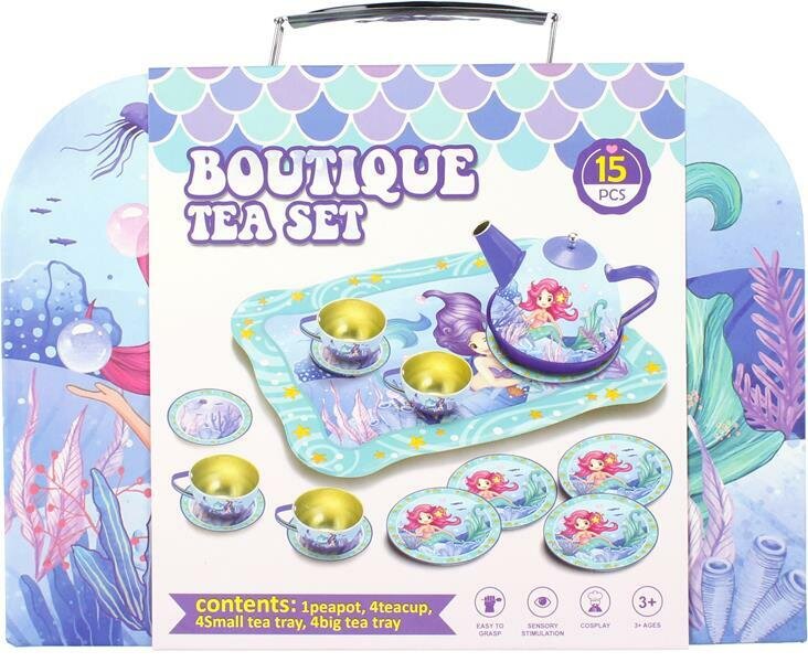 Serwis herbaciany z motywem syreny. W zestawie 15 elementów: czajnik z pokrywką, 4 filiżanki, 4 małe talerzyki, 4 talerze, taca. Komplet jest kolorowy. Wykonanie metalowe. Walizka posiada zapięcie i rączkę. Zestaw będzie idealnym dodatkiem do zabawy w kawiarnię.Wymiary opakowania:... przeczytaj całość