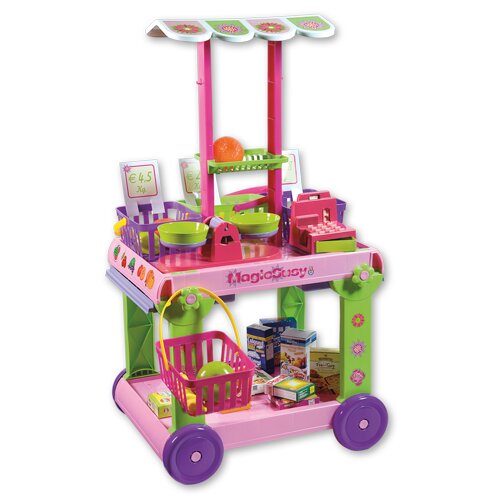Pojízdná tržnice s bočním výsuvným pultem, vyrobená z kvalitních plastů v Itálii. Obsahuje: pojízdný vozík s odnímatelnou stříškou, 4 košíky s rukojetí, pokladnu s mincemi, váhu s miskami, 12 kusů ovoce a zeleniny a 8 krabiček s potravinovým nebo drogistickým zbožím. Rozměry tržnice se stříškou:...