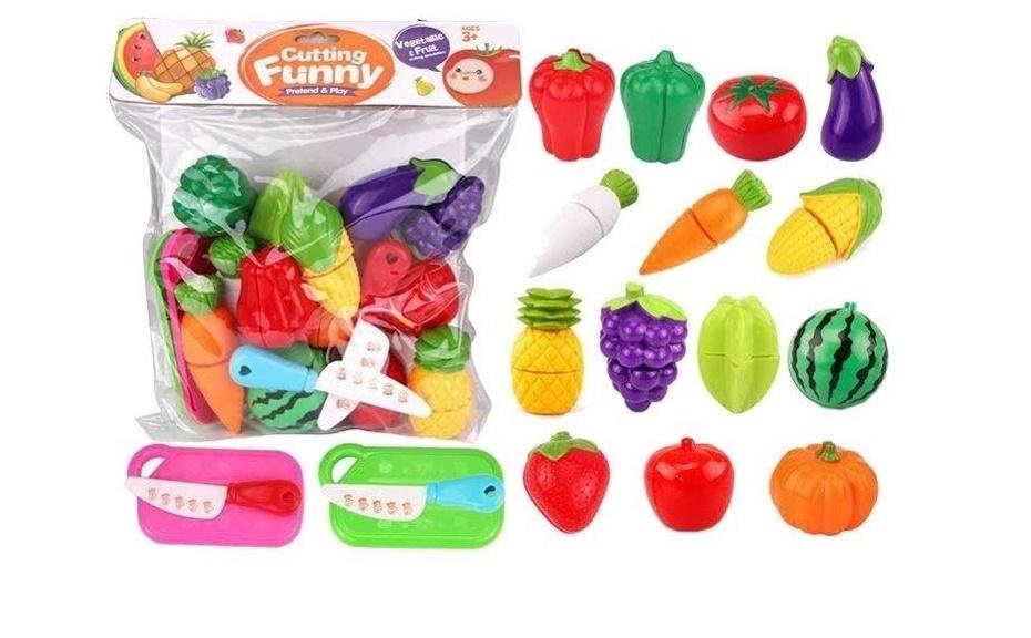 - Łącznie 18 elementów - deski, noże, owoce i warzywa podzielone na części.