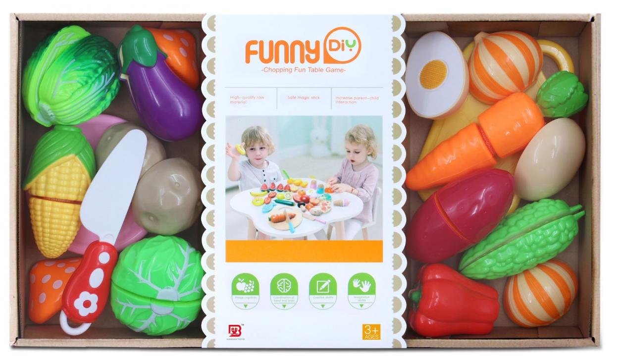 Zestaw zawiera deskę do krojenia, nóż, warzywa i owoce w dwóch częsciach łączonych rzepem. przeczytaj całość