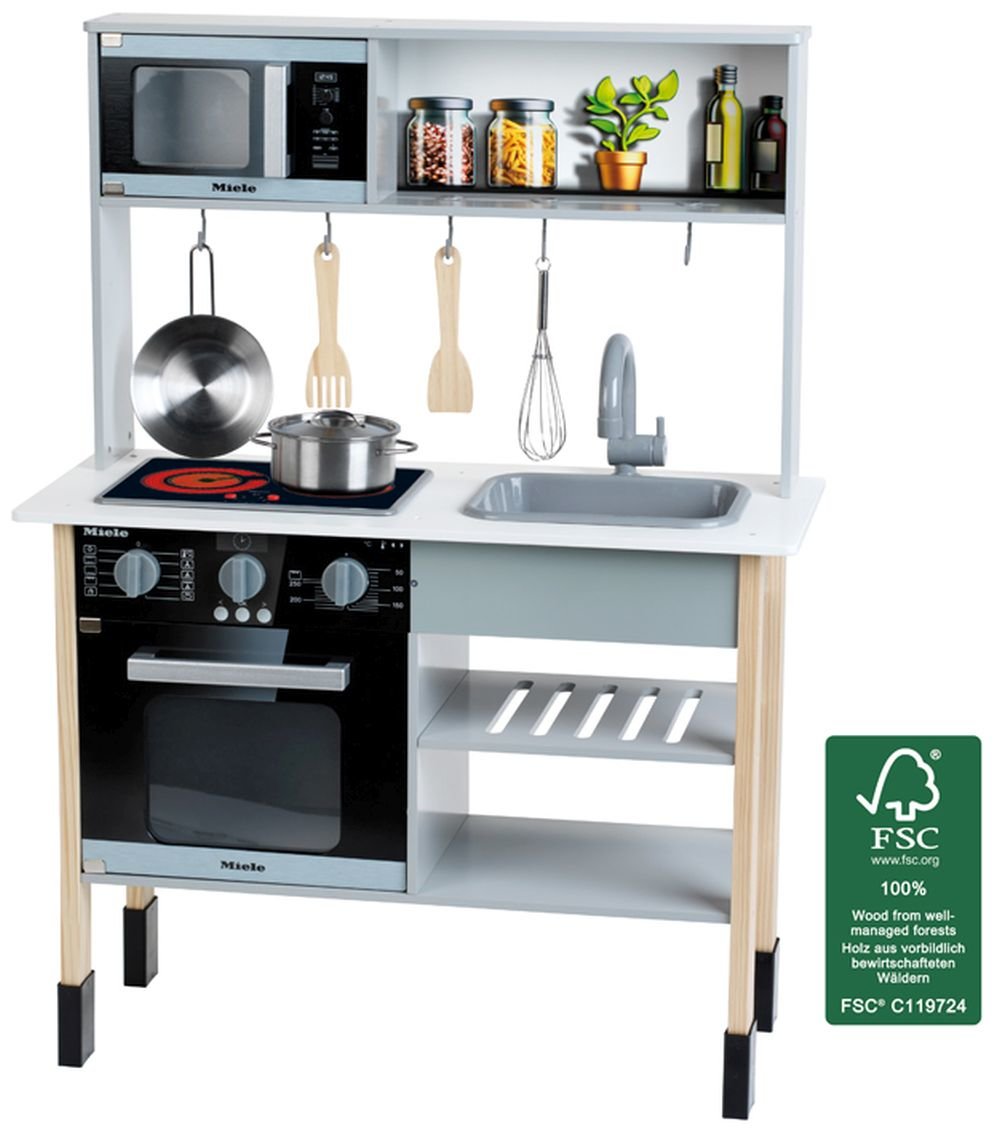 Dětská kuchyně, Miele, dřevo (MDF), bílá, midi, 70x 30 x 91 cm. - Varná deska se zvukem a funkcí duálního světla - Kamna - Mikrovlnná trouba - S vysoce kvalitním kovovým a dřevěným příslušenstvím (hrnec s víkem, pánví, šlehací metlou a 2x vařečkou ) - S odnímatelným dřezem Vhodné pro děti od 3 let przeczytaj całość