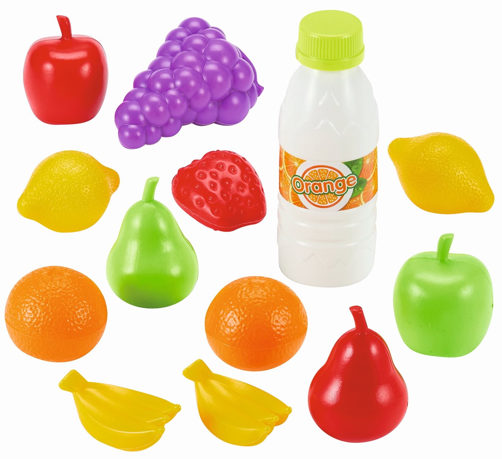 Makety potravin v síťce. Síťka obsahuje celkem 13 doplňků - 2 citrony, jahodu, 2 pomeranče, 2 jablka, 2 hrušky, 2 trsy banánů, hrozen vína a láhev pomerančového džusu. Ideální také jako vybavení obchodu nebo jako doplněk do dětské kuchyňky. Rozměry produktu (DxŠxV): 16 x 16 x 13 cm. przeczytaj całość