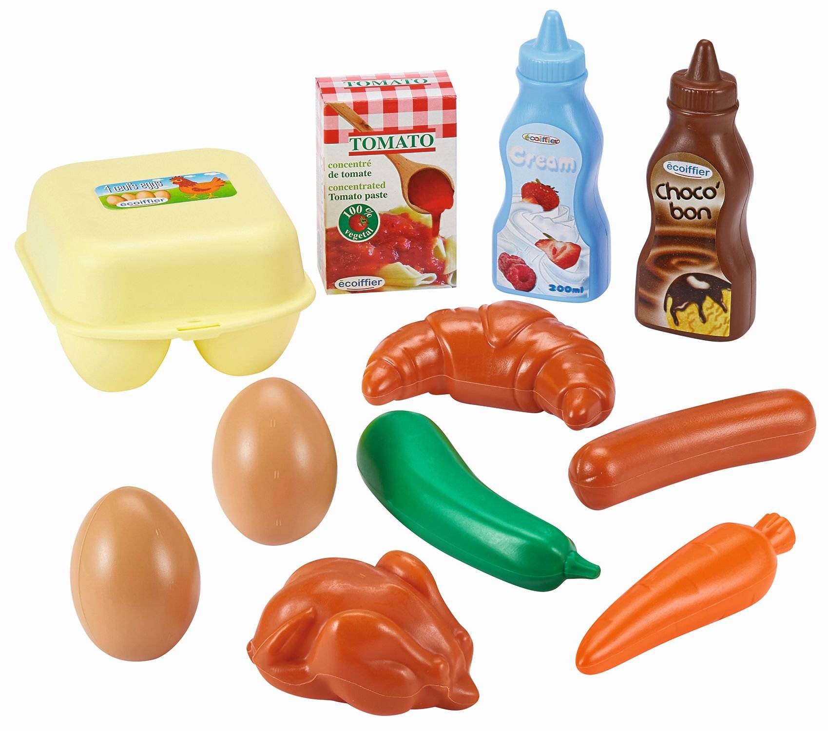 Makiety różnych produktów spożywczych, w siatce. Z tym zestawem masz wszystkie składniki na idealne śniadanie. Zawiera opakowanie jajek i 2 jajka, kurczaka, parówkę, marchewkę, ogórka, croissanta, sos pomidorowy i polewy. Idealne również jako wyposażenie sklepu lub jako dodatek do dziecięcej... przeczytaj całość
