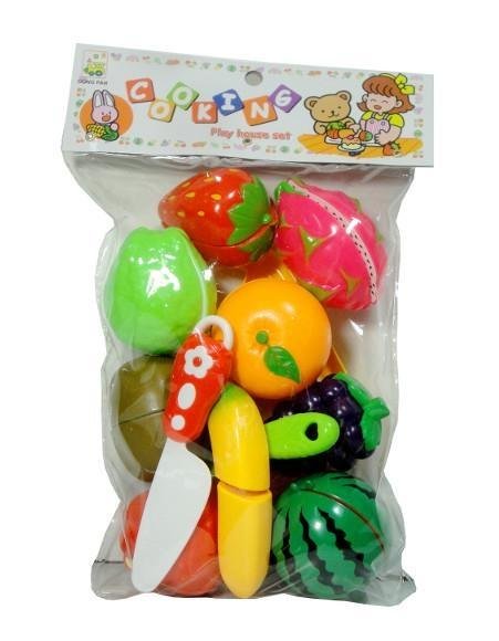 Zestaw owoców do krojenia. Owoce w zestawie poprzekrawane są na pół, łączą się za pomocą rzep. Wsród owoców znajduje się m.in.: jabłko, arbuz, winogrono, kiwi i truskawka. W zestawie oprócz owoców można znaleźć nóż, deskę do krojenia, talerzyk oraz komplet sztućców. przeczytaj całość