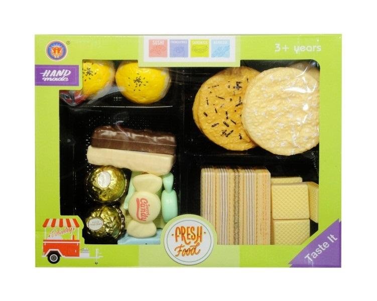Zestaw słodyczy do zabawy dla dzieci. W zestawie ciasteczka, wafelki, cukierki. Produkt zapakowany w kartonowe opakowanie z przezroczystym okienkiem. Zabawka dla dzieci od 3 lat. przeczytaj całość
