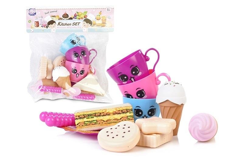 W zestawie: 3 filiżanki, 2 łyżeczki, talerzyk, 3 ciateczka, 2 lody, kanapka, wym. opk: 21,5 x 23 x 6 cm., 3+ przeczytaj całość