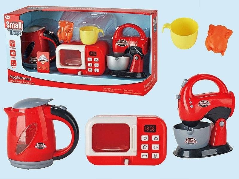 Zestaw 3 urządzeń AGD, na baterie, czajnik, mikrofalówka, mikser; 40,5x20,5x15,5cm przeczytaj całość