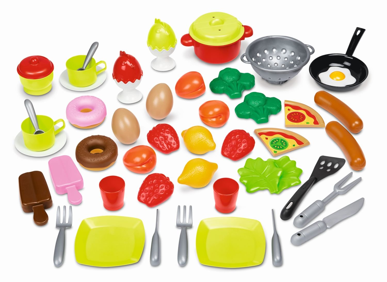 Rozsáhlá sada obsahuje nádobí a příbory pro dvě osoby, různé hrnce v různých velikostech, kuchyňské náčiní, misky na vejce a spoustu maket jídla. S dobrým úchopem a bez ostrých hran je tento doplněk pro hrací kuchyňky vhodný již pro děti od 18 měsíců. Vyrobeno ve Francii. przeczytaj całość
