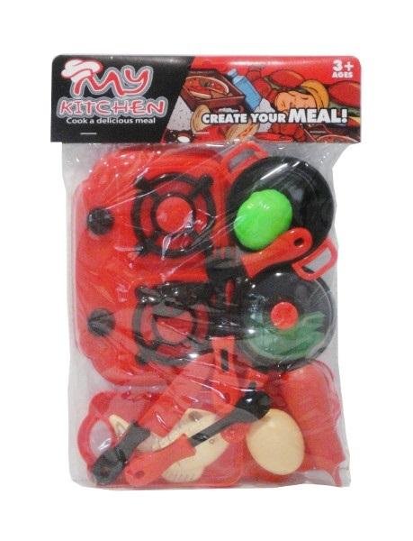 Zestaw kolorowych naczyń i akcesoriów kuchennych dla małej gospodyni domowej, przydatne podczas zabawy w dom. W zestawie można znaleźć m.in.: kuchenkę, garnek i rondelek z pokrywką, talerzyk, deseczkę, a także akcesoria kuchenne np.: nóż, łyżka, cedzak, jak również jajko, rybę czy groszek.#&Produkt zapakowany w przezroczysty worek. #&Produkt dla dzieci od 3 lat. #&Podane wymiary są wymiarami opakowania.#&