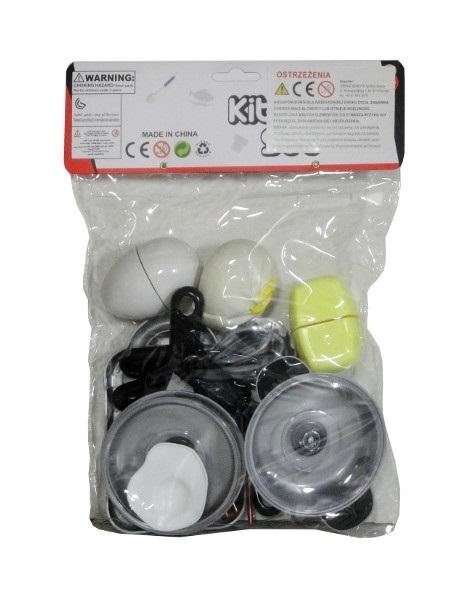 Zestaw kolorowych naczyń i akcesoriów kuchennych dla małej gospodyni domowej, przydatne podczas zabawy w dom. W zestawie można znaleźć m. in.: garnek i rondlelek z pokrywkami, a także akcesoria kuchenne np.: nóż, chochla, trzepaczka. Ponadto w zestawie znajduje się kilka produktów spożywczych...