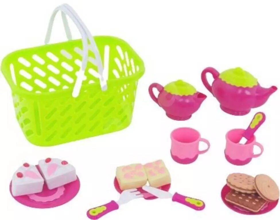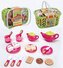 Nádobí dětské čajový servis set s maketami potravin v nákupním košíku plast