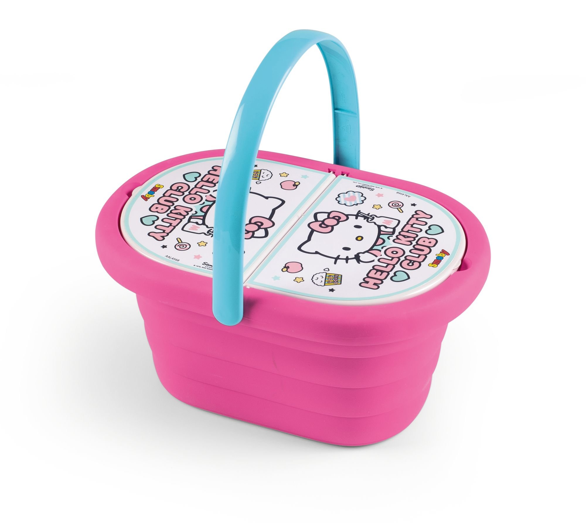 Piknikový koš Hello Kitty s dvoudílným krytem a praktickou rukojetí. Doplňky s motivy Hello Kitty jsou tři kompletní sady piknikového nádobí, které se skládají ze šálku, hrnku, sady talířů a příborů, džbánku na mléko a misky na cukr. Motivy jsou dodávány jako samolepka, takže košík a doplňky lze zdobit individuálně. Rozměry: 26,4 x 18,8 x 12,7 cm (DxŠxV).