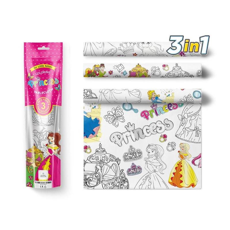 - Opakowanie zawiera 3 obrusy z wzorami do kolorowania (Księżniczki) o wielkości 120 x 110 cm z perforacją pomiędzy nimi.