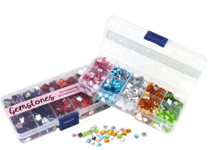 kamienie w różnych kolorach i kształtach, uporządkowane w pojemnikach. 10 powszechnie używanych kolorów w 4 różnych kształtach: serce, kwiat, koło, kwadrat. Wymiary kamyka: około 5 x 5 mm. przeczytaj całość