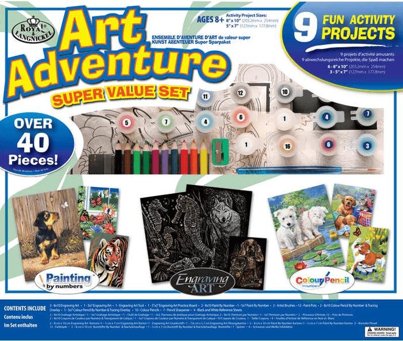 Začněte své projekty s 9 dílnou sadou Art Adventure®. Sada obsahuje 5 ”x 7” a 8 ”x 10” gravírování Art ™ designy, Malování podle barvami čísel a Malování podle patelkami čísel. Sada obsahuje: 14 kalíšků s barvami,10 pastelek, 9 předtištěných desek, 3 cvičné listy, 2 číslované průhledné překrytí, 3 cvičné kousky, 2 štětce taklon, 1 škrabadlo, 1 ořezávátko, 1x 18-jamková paleta, 1 Návod k použití.
