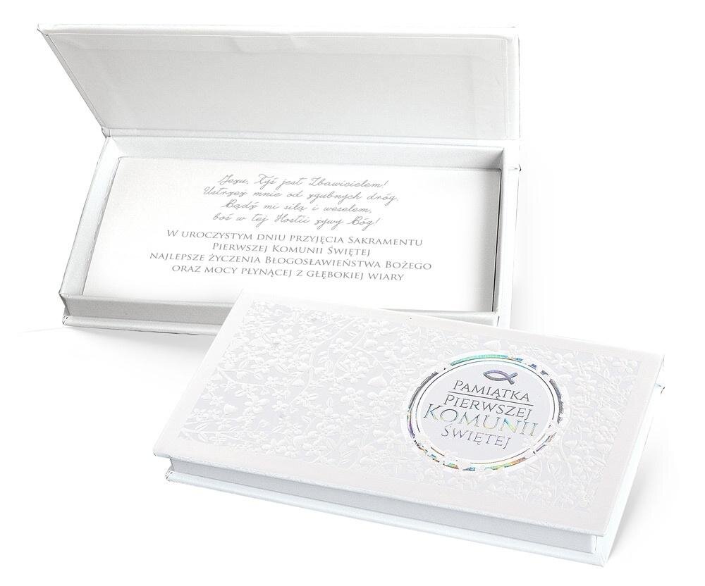 Pudełko ozdobne na banknoty MB-005 na I Komunię Świętą Pudełko jest eleganckim sposobem na podarowanie bliskiej osobie banknotu lub karty podarunkowej. Pudełko ozdobne jest uszlachetnione metalizowaną folią hot-stamp, co nadaje mu wyjątkowego charakteru. W zależności od wzoru, na pudełkach...
