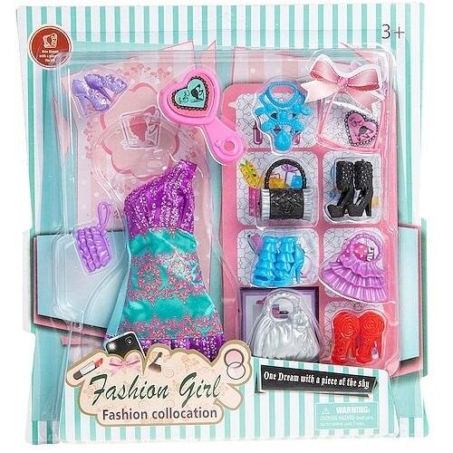 Zestaw ubranek dla lalki.W zestawie:-sukienka-4 pary butów-szczotka-okulary-4 torebki-naszyjnik przeczytaj całość