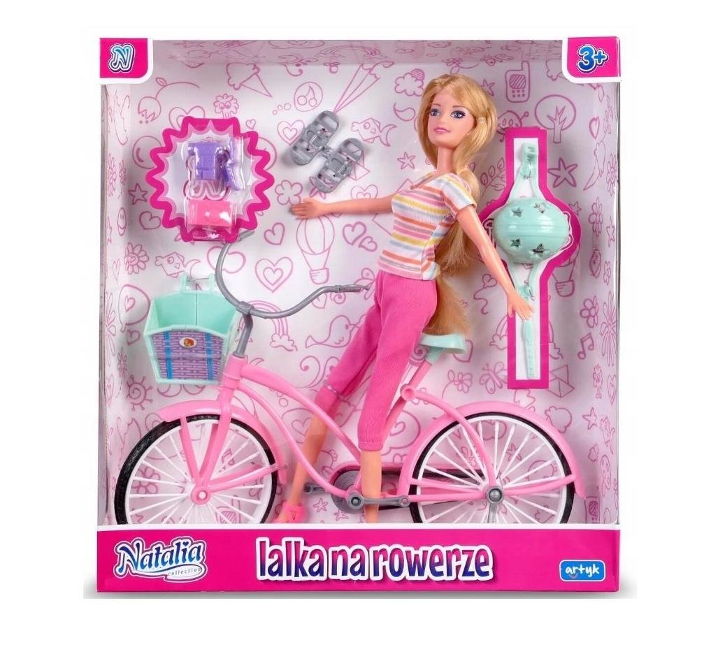 Lalka Natalia 29 cm. W zestawie: lalka, rower, kask, koszyk na rower, akecesoria. 2 wzory. Wymiary opakowania: 29x31x7cm.Wiek: 3+ przeczytaj całość
