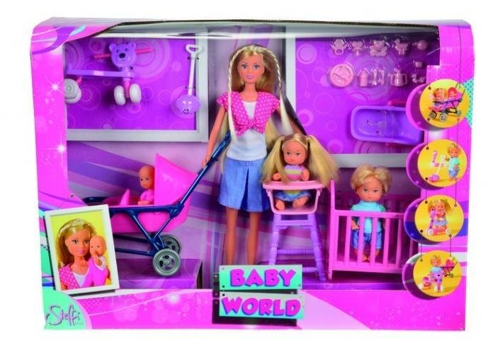 Lalka Steffi z trójką dzieci, z łóżeczkiem, krzesełkiem, jeździkiem i wieloma akcesoriami. przeczytaj całość
