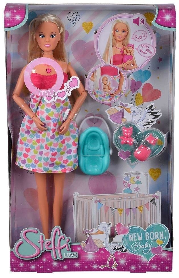 Steffi spodziewa się dziecka - mnóstwo zabawy zapewnią funkcje dźwiękowe lalki. Możemy usłyszeć bicie serca jeszcze nienarodzonego maluszka - wystarczy nacisnąć naszyjnik lalki w kształcie serca. Podczas narodzin usłyszymy płacz dziecka zwiastujący jego zdrowie i szczęście młodej mamy - wystarczy ponownie nacisnąć naszyjnik. Aby usłyszeć dźwięki zadowolonego noworodka w ramionach mamy lub uspokajającą kołysankę, należy zamknąć brzuch przez odwrócenie wbudowanej klapki i ponownie naciskać naszyjnik. Lalka ma zginane w łokciach i nadgarstkach ręce, dołączone jest nosidełko i akcesoria do pielęgnacji noworodka, funkcja try-me, wysokość lalki: 29 cm, 3l+