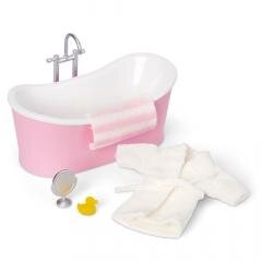 "Elegancka, nowoczesna łazienka musi mieć stylową wannę, w której można się zrelaksować po długim dniu zabawy. Zestaw wyposażenia do łazienki w domku dla lalek Lundby zawiera wolnostojącą różową wannę z wysokim kranem, lusterko, mięciutki szlafrok i uroczą żółtą kaczuszkę do zabawy.Wykonany z...