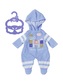 Život s Baby Annabell není nikdy nuda. Existuje tolik různých her a heren, které je třeba prozkoumat. A k tomu je samozřejmě potřeba i pohodlný obleček. Modré dupačky s kapucí jsou ozdobeny potiskem kostiček. Oblíbená ovečka Baby Annabell vesele hopká po světle modrém tričku s růžovými rukávy....