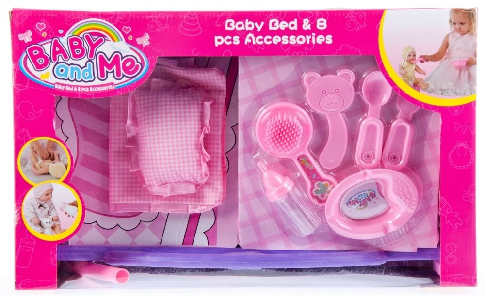 Výhody produktu: Dětská postýlka pro panenky, plastová, s hračkami. Sada obsahuje plastovou postýlku, 1 x přikrývku na polštář, 1 x láhev, 1 x kartáč na vlasy, 1 x talíř, sadu příborů. Rozměry balení {l. X výška a hloubka) {cm} 47x21x28, hmotnost balení {kg} 1,19 kg. Hračka určená pro děti od 3 let. Produkt je zabalen v krabici s okénkem.