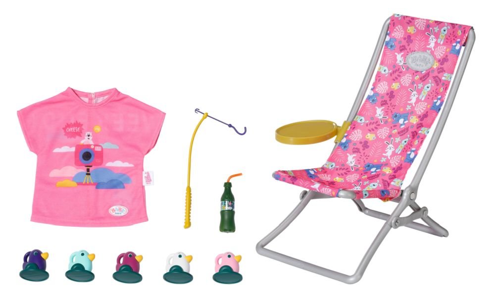 "„V moři je ryb mnohem víc…“ Ale BABY born raději chytá roztomilá káčátka. Zatímco pohodlně sedí v růžovém lehátku s barevným vzorem, snaží se na háček udičky chytit jednu z pěti kačenek. Tu a tam si usrkne limonádu, kterou má položenou na žlutém stolku u lehátka. Když vyloví všechny kačenky a má...