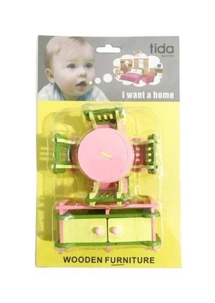 Drewniane mebelki dla lalek szafka, stolik z 4 krzesłami. Produkt zapakowany w kartonową podstawkę z przezroczystym kloszem. przeczytaj całość