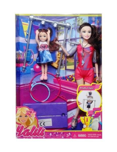Lalka (typu Barbie) wraz z dzieckiem ćwiczą razem na sali ćwiczeń. W zestawie znajdują się 2 lalki (mniejsza i większa), a także drążek do ćwiczeń, 2 x hula hop (mniejsze, większe), step do ćwiczeń, a także puchar. Produkt zapakowany w kartonowe opakowanie z okienkiem. przeczytaj całość