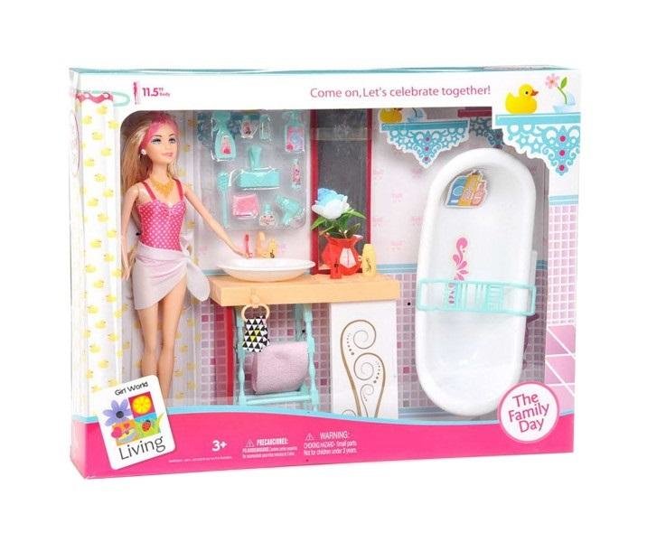 Lalka (typu Barbie) z mebelkami łazienkowymi jak: wanna, umywalka, a także innymi akcesoriami: szczotka, suszarka, ręcznik, butelka szamponu, balsamu. Produkt zapakowany w kartonowe opakowanie z przezroczystym okienkiem. Zabawka dla dzieci od 3 lat. przeczytaj całość