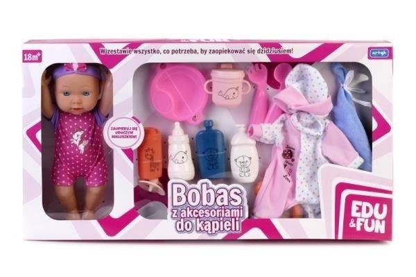 Lalka Bobas Edu&Fun z akcesoriami do kąpieli 36 cm.W zestawie:lalka 28 cm,sztućce,miseczka,4 kosmetyki,gryzak,smoczek,ręczniczek,ubranko na zmianę.Lalka przeznaczona dla dzieci od 18 miesięcy. przeczytaj całość