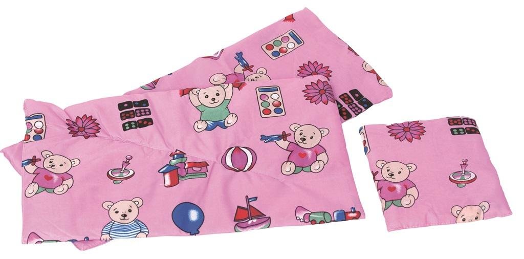 Zestaw kolorowej pościeli do łóżeczek i kołysek dla lalek składający się z: materacyka 56x24cm, kołderki 49x27cm, poduszki 21x20cm. Dostępny w różnych wariantach kolorystycznych. przeczytaj całość