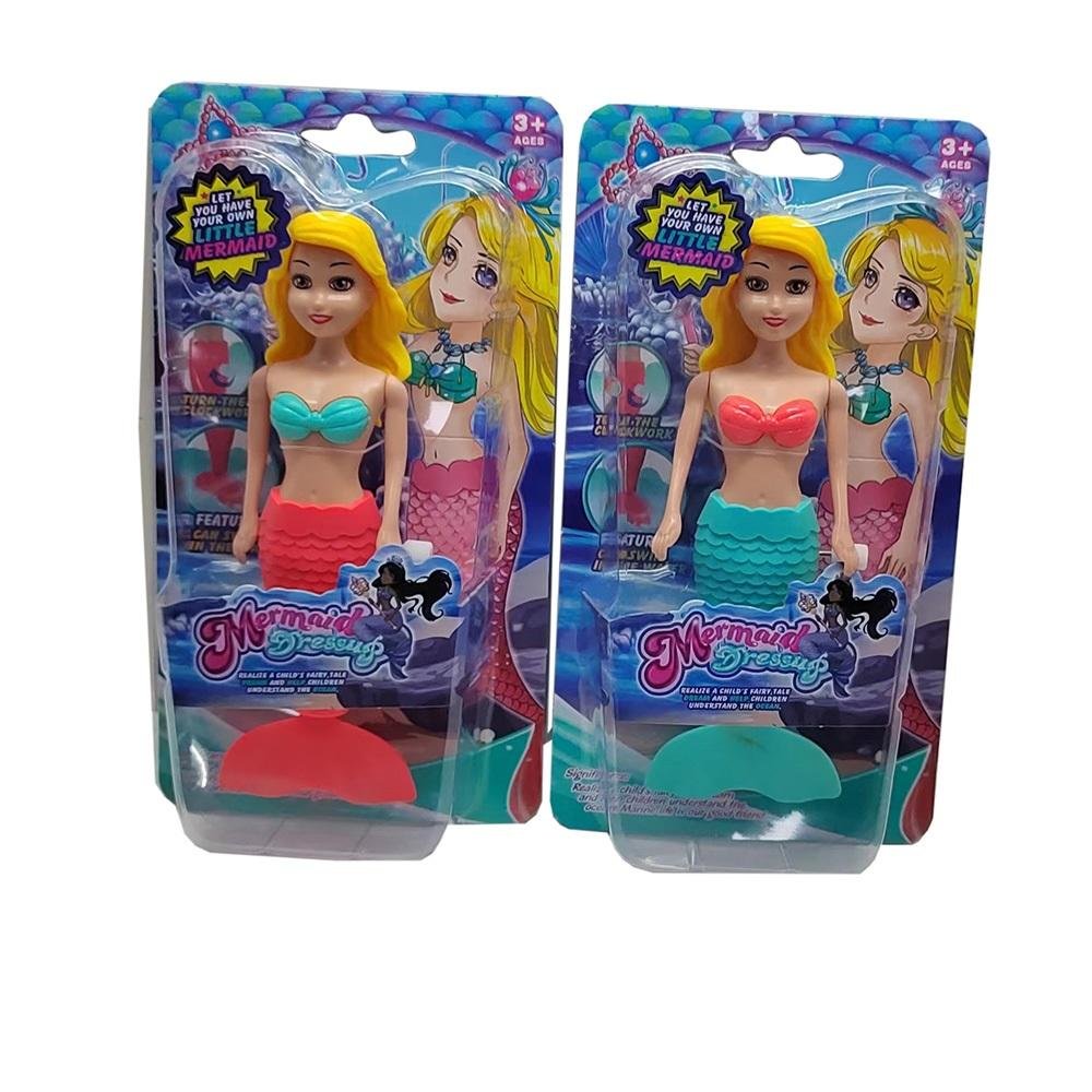 Mix wzorów, towar wysyłany losowo.Lalka syrenka, w dwóch wersjach kolorystycznych syrenich ogonów, nakręcana. Po nakręceniu pływa. Wysokość lalki - 18 cm przeczytaj całość