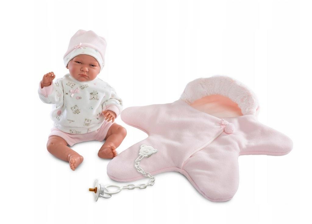Noworodek Lala:ma 42 cm,wykonana jest z delikatnego, przyjemnego w dotyku winylu, tułów wypełniony jest miękką wyściółką,po naciśnięciu miękkiego brzuszka lala płacze i mówi "mama, papa",rączki i nóżki są ruchome.śliczne niebieskie oczy z wklejonymi rzęsami, otwarte na stałe,dołączony smoczek...