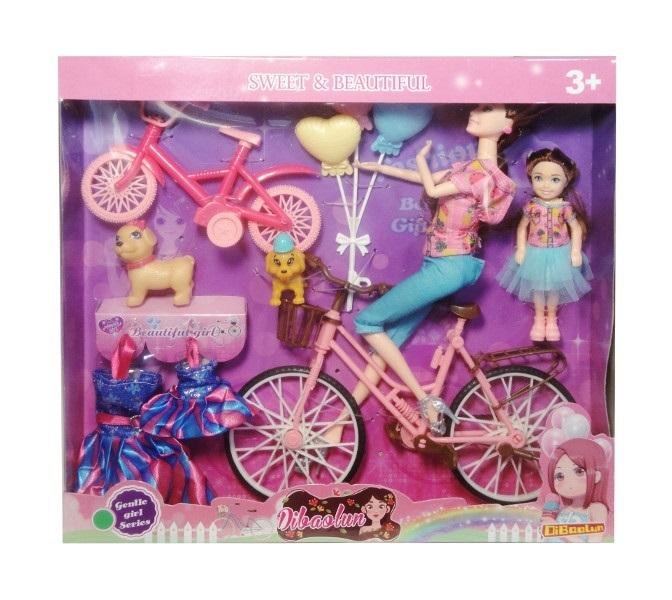 Lalka na rowerze w zestawie z mniejszą lalką. Obie lalki mają rowery oraz sukienkę na przebranie. W zestawie rówież balony i figurki piesków. #&Produkt zapakowany w kartonowe opakowanie z przezroczystym okienkiem. #&Zabawka dla dzieci od 3 lat. #&Podane wymiary są wymiarami opakowania. przeczytaj całość