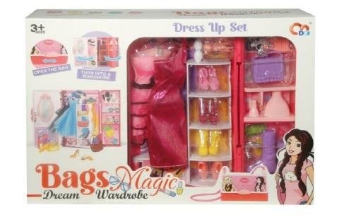 Kolorowa szafa dla lalek, którą można nosić jako torebkę. Po otwarciu wystarczy obrócić torebkę i mamy szafę. Szafa kryje w sobie wiele niespodzianek. Posiada w swoim wyposażeniu: lustro, sukienki, buty, biżuterię i torebki. Podane wymiary są wymiarami opakowania. Produkt zapakowany w kartonowe opakowanie z przezroczystym okienkiem. Zabawka dla dzieci od 3 lat.