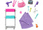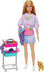 Lalka Barbie Malibu zajmuje się stylizacją włosów i makijażem z pomocą 14 akcesoriów, takich jak piesek, wózek stylistki, pelerynka fryzjerska, suszarka do włosów, szczotka i paletka do makijażu.