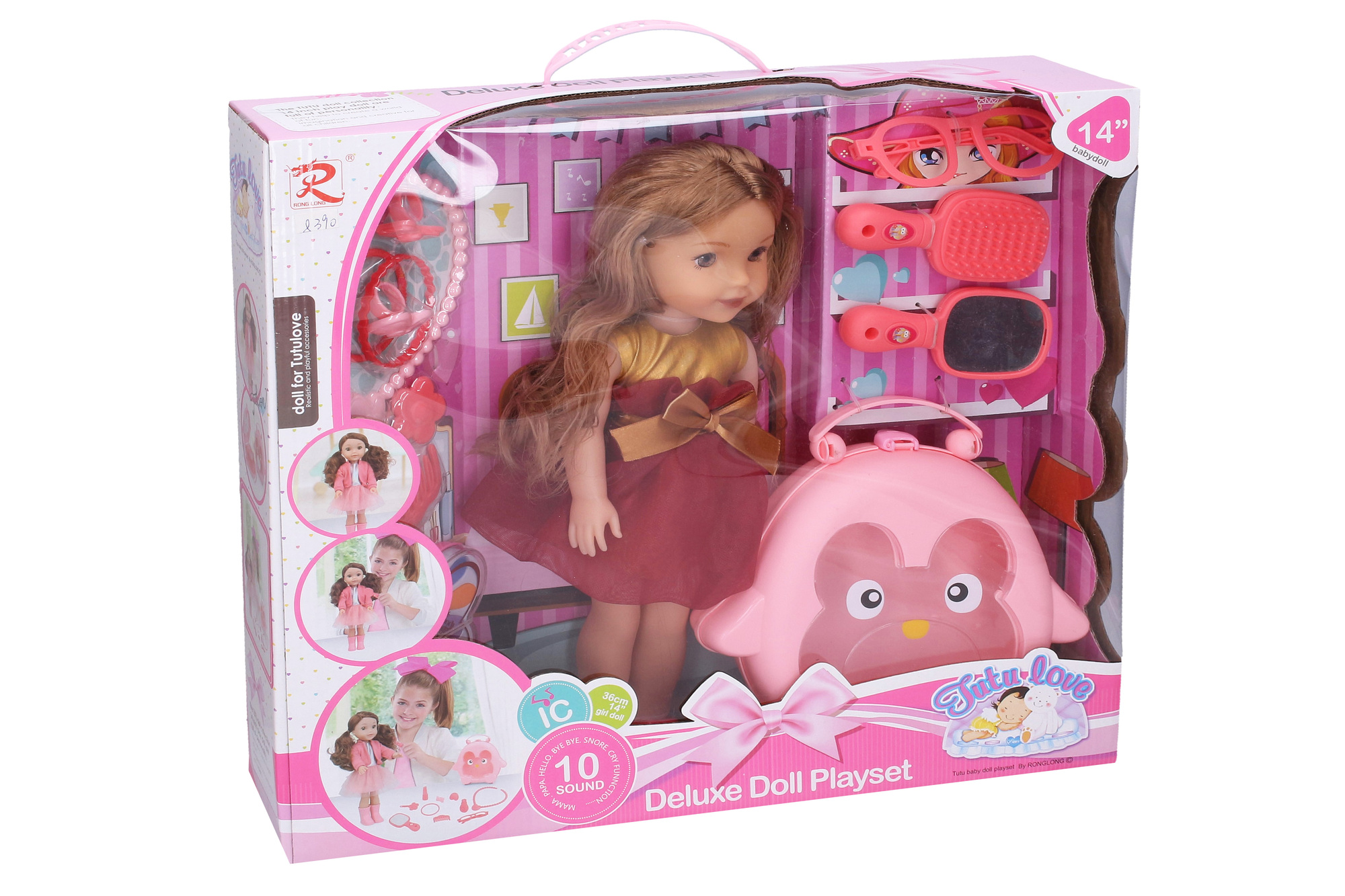 Lalka z akcesoriami. Rozmiar 35 cm. Efekty dźwiękowe. Zawiera lalkę, akcesoria dla lalki i dla dziewczynki, torebkę do przechowywania akcesoriów. 3x AG13 baterie w zestawie. przeczytaj całość